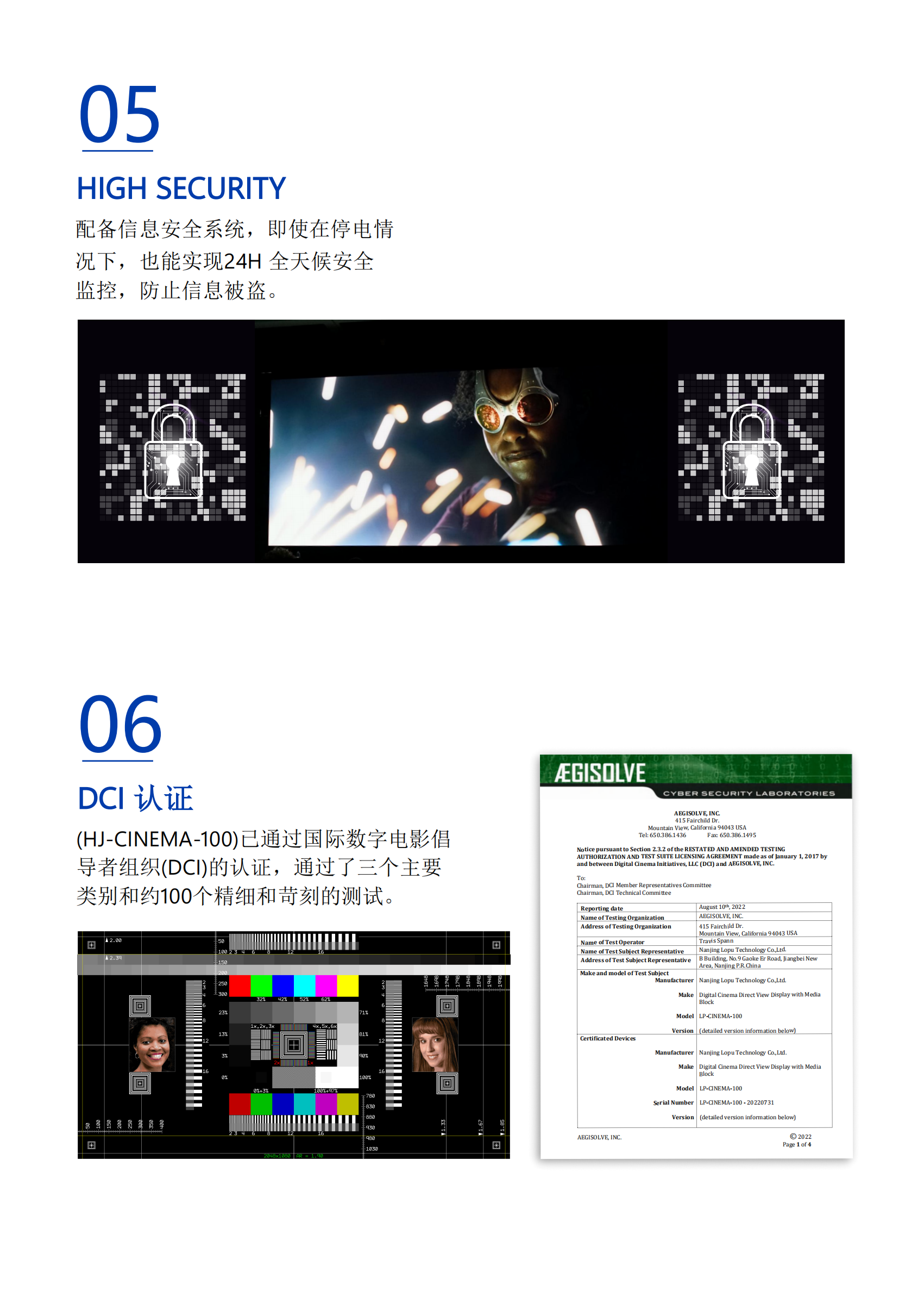 1.經(jīng)DCI電影標(biāo)準(zhǔn)認(rèn)證,支持無(wú)損回放,并兼容2K和4K常規(guī)DCP格式電影的投影
