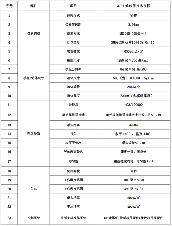 ● P3.91 地磚屏模組,發(fā)光燈珠采用 SMD2020 三合一設計,使 得 LED 地磚屏在室內(nèi)還是戶外使用都具有很好光效。